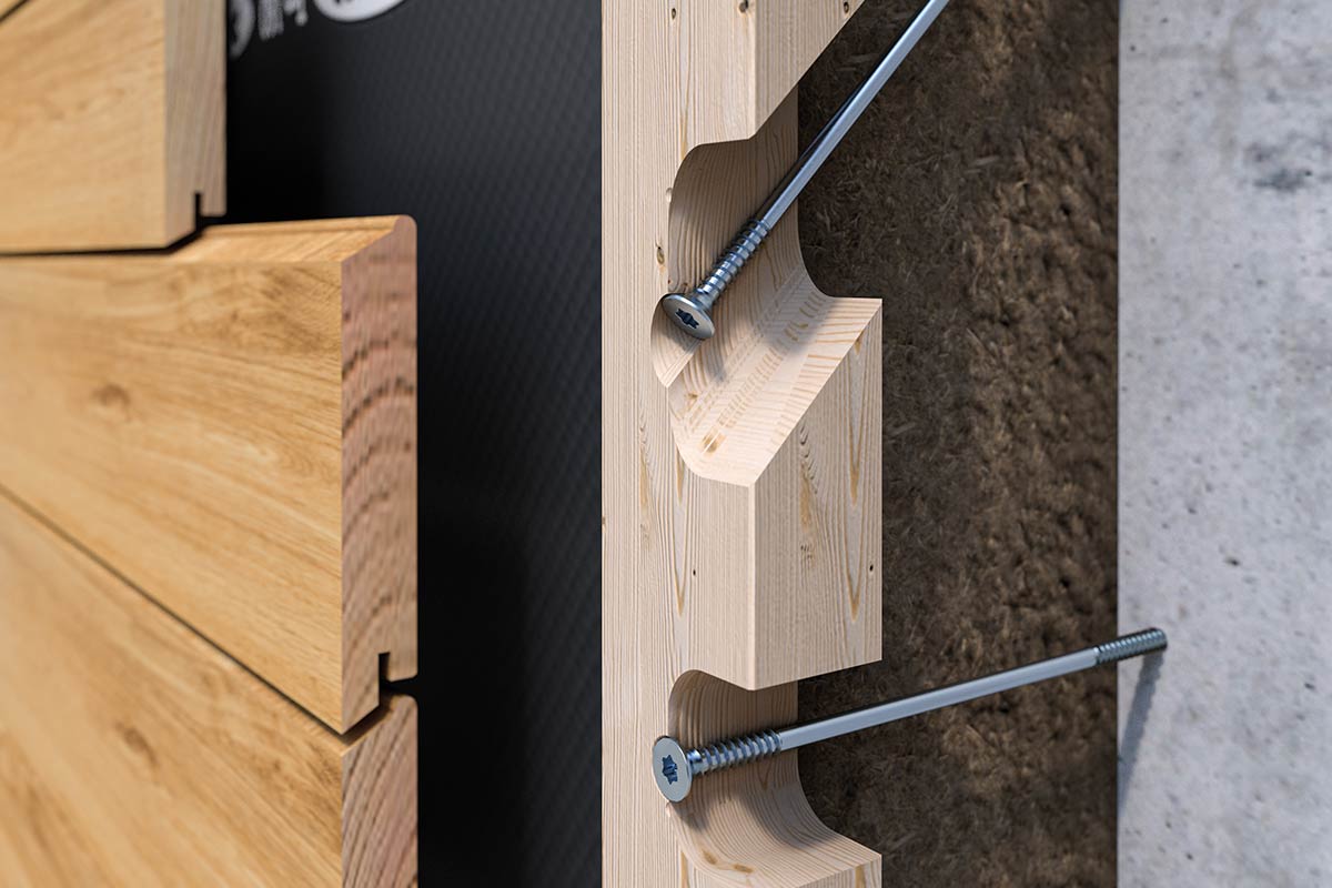Eurotec's Blue-Power system screw offers a quick and efficient solution wherever timber substructures are attached to concrete or masonry at a distance. The screws have the advantage of absorbing the effects of both tensile and shear forces. When used in façade insulation, the insulation material absorbs some shear forces, so the insulation product must have a compressive strength of at least 50 kPa at 10% compression. In addition, the cross-section of the C24 battens should be at least 30 × 50 mm. The Blue-Power system screw allows for easy and clean installation as no additional fixings are required.