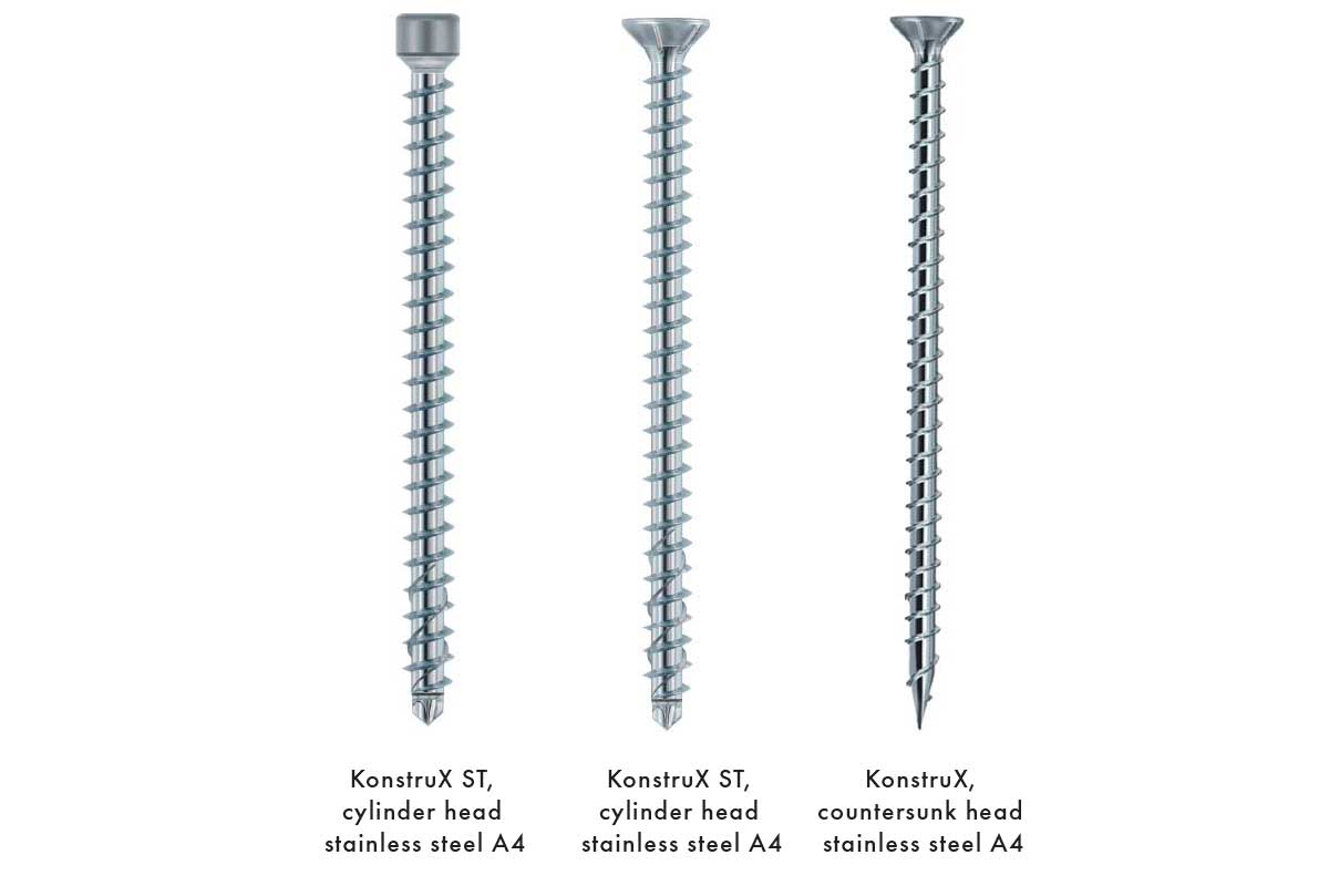 However, it is not only the timber of a structure that must be suitable for the corresponding application – even the choice of fasteners plays an important role when it comes to corrosion resistance in the installed components. Our A4 stainless steel KonstruX screws are suitable for a wide range of applications and for both indoor and outdoor use. The category of stainless steel used for these screws also make them suitable for use in timber containing tannins and in aggressive, salty atmospheres. The screws can therefore be used in service classes 1 to 3 according to DIN EN 1995 – Eurocode 5 (A4 T5/CRC III). What distinguishes the KonstruX A4 screws is their high level of corrosion resistance – which make them a particular effective choice for use in heavily polluted urban and industrial areas as well as coastal regions. This screw is also a popular choice for use on playgrounds, balconies, pergolas and in hydraulic engineering. All KonstruX screws come with an ETA certification.