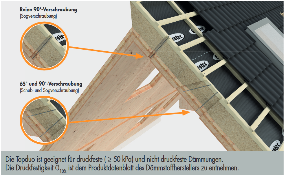 Die Topduo Dachbauschraube von Eurotec bietet eine breite Palette an Anwendungsmöglichkeiten im Holzbau – besonders bei der Aufsparrendämmung von Schrägdächern. Sie gewährleistet eine zuverlässige Befestigung sowohl von druckfesten als auch von nicht druckfesten Dämmstoffen und trägt somit maßgeblich zur Stabilität und Langlebigkeit der Konstruktion bei. Mit ihrem hohen Ausziehwiderstand ist die Topduo auch für verschiedene andere Holzbauanwendungen geeignet. Die Schraube verfügt über ein Doppelgewinde und ist mit einem Teller- als auch Zylinderkopf erhältlich.