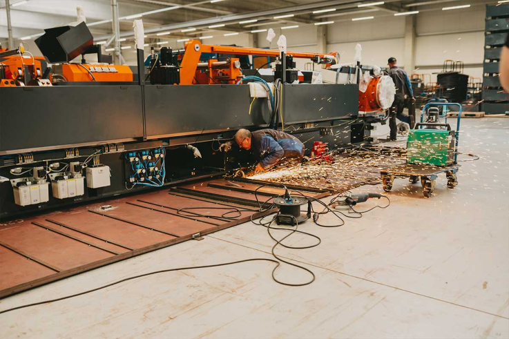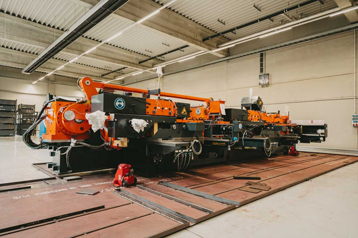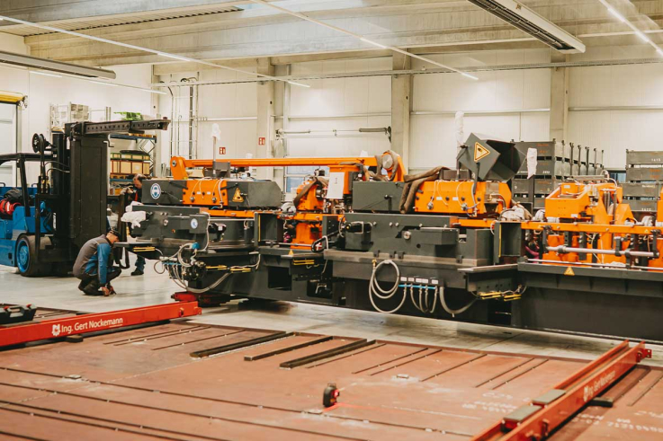 Für die Herstellung unserer Vollgewindeschraube ist eine neue Kaltumformanlage in unsere Produktionshalle eingezogen und findet dort ihren Platz. Mit einem stolzen Gewicht von 35 t und einer Länge von 14 m sowie einer Breite von fünf Metern kann die Maschine nahezu 90 Schrauben pro Minute produzieren. Dies entspricht rund 129.600 Schrauben pro Tag in einem Drei-Schicht-Betrieb.