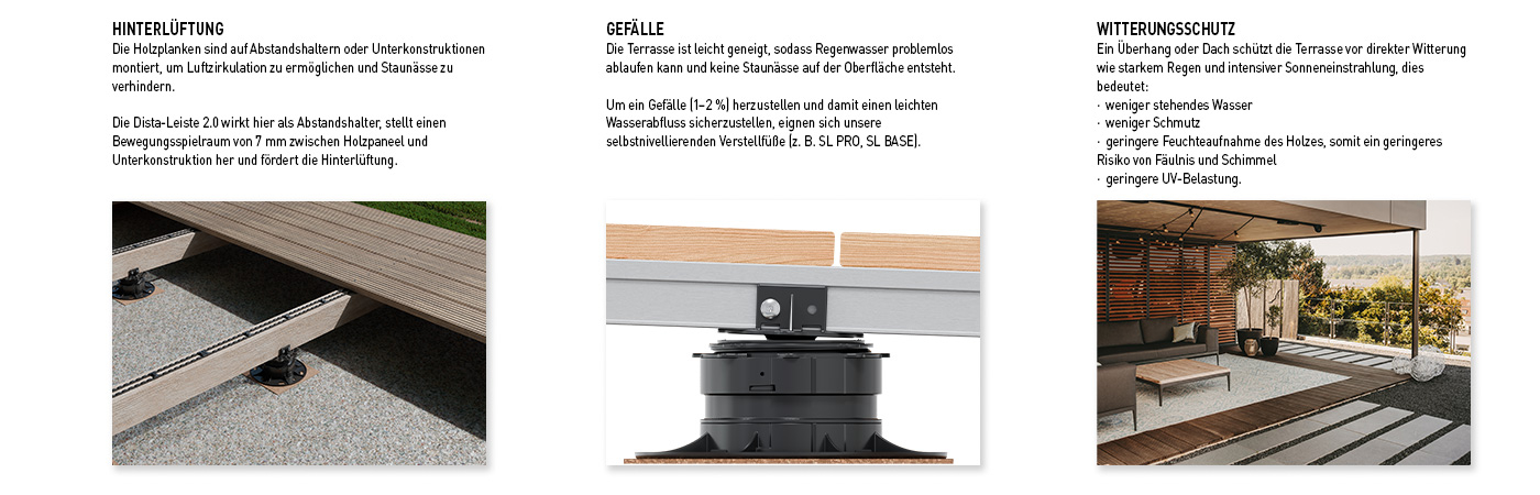 Unter konstruktivem Holzschutz werden alle baulichen Maßnahmen definiert, die verhindern, dass der Baustoff Holz übermäßig Feuchtigkeit ausgesetzt ist. Im Gegensatz zum chemischen Holzschutz wird beim konstruktiven Holzschutz einer Terrasse auf fachgerechte Bauweisen sowie widerstandsfähige, dauerhafte Materialien gesetzt. Für den Bau einer Holzterrasse bedeutet dies somit eine sinnvolle Planung sowie Montage, um Schäden zu verhindern und die Dauerhaftigkeit sicherzustellen. Wer hier vorausschauend plant, sorgt von Anfang an für den nötigen Holzschutz.