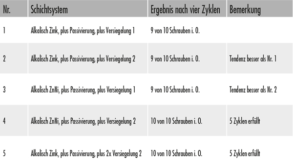 Beim direkten Vergleich der beiden Beschichtungssysteme fällt auf, dass die Härte von der Lamelle über die Zinkbeschichtung bis hin zur Zink-Nickel-Beschichtung zunimmt. Eine Zink-Nickel-Beschichtung verspricht eine sehr hohe Korrosionsbeständigkeit. Die Gefahr von Wasserstoffversprödungen ist bei galvanischen Überzügen hoch. Je höher die Schichtdicken sind, desto größer wird die Gefahr der Wasserstoffversprödung. Lamellenbeschichtungen sind wenig abriebbeständig und anfällig gegen mechanische Beschädigungen. Der Transport- und Verpackungsprozess führt zur Beeinträchtigung der Korrosionsbeständigkeit. Aufgrund der Vergleichbarkeit können Testresultate daher nur an Proben direkt nach der Produktion durchgeführt werden. Die Resultate sind nicht repräsentativ.