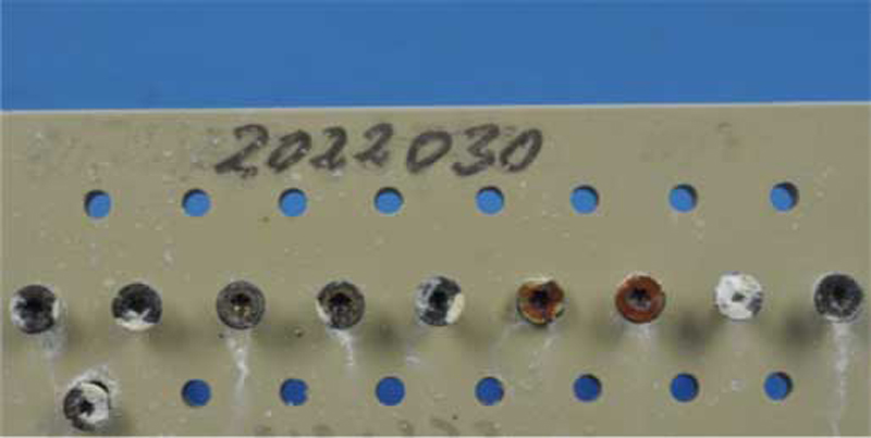 Die Schraubenköpfe der Paneltwistec 1000 Sonderbeschichtung sind weiterhin ohne Rotrost. Der Gewindebereich ist hingegen teilweise von Rotrost befallen. Weiterhin auffällig ist, dass das Holz teilweise bereits stark verwittert und verfault ist. Selbst die gelb verzinkten Schrauben, die eigentlich nur für die NKL 1 und NKL 2 zugelassen sind, sind im Gewindebereich noch nicht stark von Rotrost befallen. Alle Schrauben werden im Gewindebereich vom Holz geschützt und bleiben dadurch größtenteils von Korrosionsprozessen verschont.